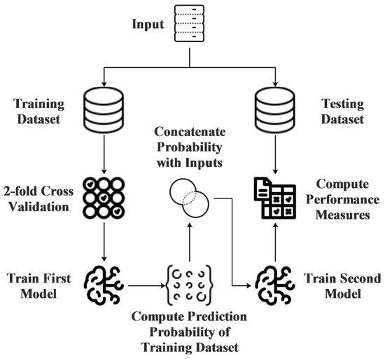 The first stage of the model aims to compute the prediction probability of all samples in the training dataset. To achieve this goal, 2-fold cross-validation was employed in the initial phase of the proposed model to prevent overfitting. The SVC model was trained using the first fold of the training dataset to compute the prediction probability of the second fold, and conversely, another SVC model was trained using the second fold of the training dataset to compute the prediction probability of the first fold. After calculating the prediction probability of the training dataset, the features were concatenated, and a second model was trained to determine the final class of samples. In the second phase, MLP, RF, DT, and LR models were trained separately. In this study, 10-fold cross-validation was implemented instead of the holdout method; therefore, this process was applied individually for each fold of the dataset [17].