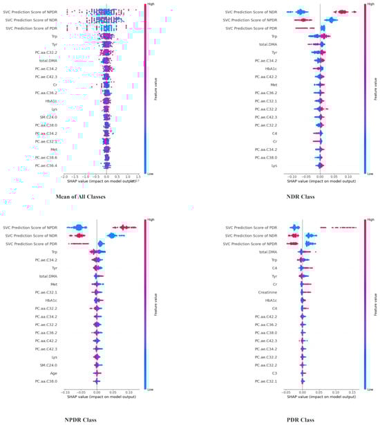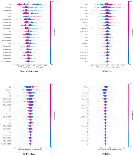 Figure 2 illustrates the different patterns of feature importance across the DR classes, indicating that certain biochemical and physiological parameters are more relevant for certain conditions. Glucose and glycine show significant importance in all classes but are particularly impactful in the NPDR class. The analysis of SHAP values across different DR classes provides insights into the model’s behavior and decision-making process. The model leverages a complex interaction of features where metabolic and age-related factors like glucose, glycine, and age appear consistently across the classes, suggesting their universal importance in the pathology of DR. The prominence of specific metabolites and amino acids such as taurine, creatinine, and various phosphatidylcholines highlights the potential metabolic underpinnings of DR progression. This could suggest pathways for targeted therapeutic interventions or for biomarkers in clinical settings. In the PDR class, a marked influence of creatinine and the phosphatidylcholine molecules suggest a shift towards more systemic and nephrological influences as DR progresses to more severe forms. This shift is crucial for understanding how DR could be connected to broader systemic conditions.