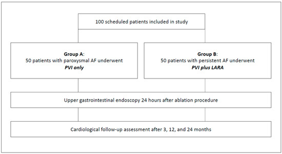 The main purpose of the present cohort study was to investigate the burden of endoscopically detected esophageal lesions (EDELs) after PVI only (Group A) and PVI plus LARA (Group B) without the use of an esophageal temperature probe.