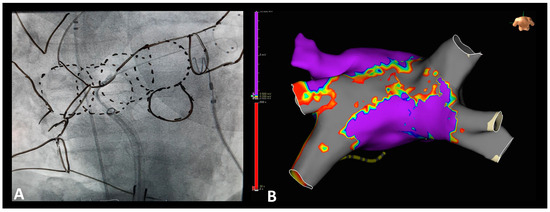 (A) Left atrial roof ablation (LARA) technique using cryoballoon ablation in RAO 30° view. The borders of the left atrium, pulmonary veins, transseptal puncture site, and overlapping freezes were traced on the examiner monitor using a board marker; (B) 3D representation of LARA in the Voltage MAP (threshold 0.5/0.2 mV) during AF Redo procedure in follow-up using the EnSite Precision Cardiac Mapping System (Abbott). RAO = right anterior oblique; AF = atrial fibrillation.