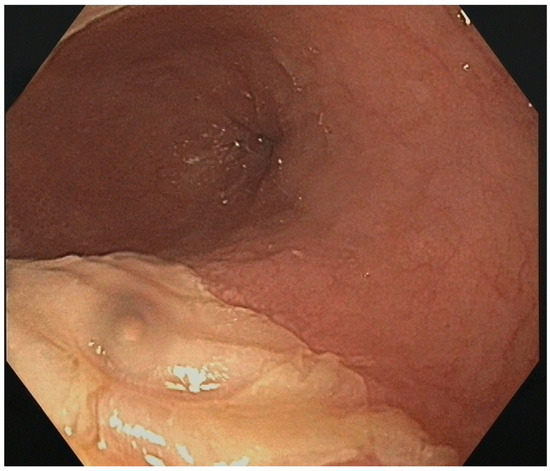 Ablation-related esophageal lesions were identified in only 1 of the 92 patients. This manifested as a superficial ulcer measuring approximately 2 cm and corresponding to a type 2a lesion under the Novel Kansas City Classification. The lesion was located in the mid-esophagus region, approximately 28 cm from the dental arch, retrocardiac at the anterior wall of the esophagus (Figure 3). This event was observed in Group A (Table 2) and remained clinically silent. Additional gastroesophageal reflux disease (GERD) as a comorbidity could not be identified in this patient. Compared to the overall study cohort, the patient with the observed superficial ulcer had slightly lower temperatures in most pulmonary veins: LSPV −52 °C vs. −48 °C, RSPV −56 °C vs. −53 °C, and LIPV −47 °C vs. −46 °C. Conversely, temperatures of −43 °C were measured at the patient’s right inferior pulmonary vein (RIPV), compared to −51 °C in the overall study cohort. The LA index was 30.8 mL/m2 compared to the median 39 mL/m2 (IQR 29.9–50.9) in the total study group. Furthermore, the patient’s BMI was 27.1, compared to a median BMI of 28.45 kg/m2 in the overall patient population.