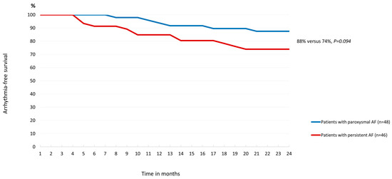 Categorical variables were reported as frequencies and percentages. The normal distribution was assessed using Kolmogorov–Smirnov’s one-sample test. Nonparametric data were analyzed using a two-tailed Mann–Whitney U-test. The Yates Chi-Square test was utilized to compare relative frequencies. For presenting proportions of patients free of arrhythmia in the follow-up time, survival curves were calculated and plotted as a graph (patients with persistent versus paroxysmal AF were compared). Statistical analysis was conducted using SPPS software (version 22.0. IBM Corporation, Armonk, NY, USA).