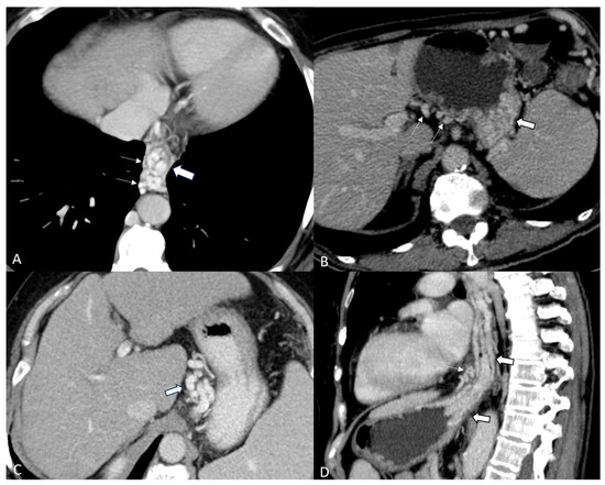 Esophageal varices, representing the tortuous dilatation of the esophageal veins, are clearly visible on a CT examination in the venous phase as contrasting tubular structures adjacent to the esophageal mucosa or protruding into the lumen with round or scalloped edges. Paraoesophageal varices, frequently associated with esophageal varices, are venous dilatations that extend outside the esophageal wall and appear on post-contrast CT examinations as tortuous vessels extending along the distal esophagus (Figure 1A).