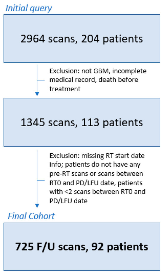 Patient inclusion/exclusion flowchart. Patients were excluded if they did not have GBM, had incomplete clinical records, or died before radiotherapy treatment (N = 91). Additional patients were excluded if the radiotherapy (RT) start date was unknown or if patients did not have [1] pre-RT scans, [2] scans between the starting date of RT (RT0) and the recorded date of PD, and/or [3] lack of follow-up date (N = 7). Finally, one final round of exclusions was conducted for patients with less than 2 scans between the RT0 and PD dates (N = 21). The final patient population for analysis included 92 patients with a total of 725 follow-up scans. RT0 = radiotherapy start date, F/U = follow up, LFU = lack of follow-up, RT = radiotherapy, GBM = glioblastoma multiforme.