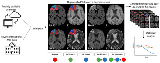 Following the masking of the skull using CaPTk, we utilized a third publicly available AI model for brain lesion segmentation based on the nnU-Net architecture [31]. The original publication detailing this work is available from Isenee et al. [20], and the model weights are available from [32]. Briefly, the model was trained using 5-fold cross-validation on n = 369 training cases available from the 2020 Brain Tumor Segmentation (BraTS) Challenge, and validation is obtained from an ensemble (average) of the final trained models from each fold. This final ensembled model achieved validation mean Dice scores of 91.24, 85.06, and 79.89 for whole tumor, tumor core, and enhancing tumor, respectively. Input to the model requires all four MRI sequences to be masked to the brain organ. This model architecture has placed in the top 3 models for several Brain Tumor Segmentation (BraTS) Challenges for segmentation tasks and survival predictions [33,34]. The segmentation mask output of the nnU-Net is one of four classes (background, edema, non-contrast-enhancing tumor (NET), and contrast-enhancing tumor (CET)). From the final segmentation results, we defined total tumor (TT) volume as a summation of NET and CET regions. Similarly, total volumetric burden (TB) was defined as the combination of NET, CET, and edema regions. Brain organ and lesion segmentation models were applied to all scan timepoints for all patients, and volume-based metrics were collected. The overall study workflow, along with a representative visual example of these volumes is shown in Figure 2.