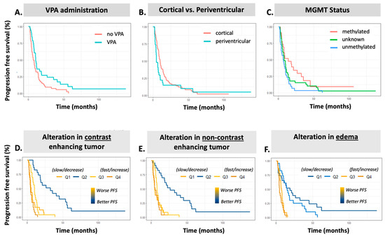 Kaplan–Meier plots for all-time progression-free survival prediction. Top Row. KM plots clinical variables: (A) VPA, (B) tumor region, and (C) MGMT status. Bottom Row. KM plots for AI volumetric slopes: (D) ∆CET, (E) ∆NET, and (F) ∆Edema. VPA = valproic acid administration, CET = contrast-enhancing tumor, NET = non-contrast-enhancing tumor, PFS = progression-free survival.