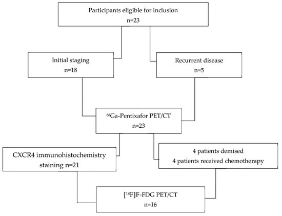 Twenty-three patients with histologically confirmed locally advanced carcinoma of the oral cavity, nasopharynx, and oropharynx were prospectively recruited into this study. Inclusion criteria were age ≥ 18 years, biopsy-proven head and neck carcinoma, and a signed consent form. Exclusion criteria included technically suboptimal scans and a synchronous malignancy. The patients were referred for PET/CT imaging as part of their work-up for initial staging prior to therapy (n = 18) or suspected recurrence (n = 5); all 23 patients underwent [68Ga]Ga-Pentixafor PET/CT. A total of 4 patients died before the [18F]F-FDG PET/CT appointment; 3 patients had chemotherapy in the interim, and therefore, their [18F]F-FDG PET/CT scans were not included in the analysis. The composition of enrolled patients is summarized in Figure 1. Informed consent was obtained from the patients for the scan and for accessing their hospital records. This study was approved by the Human Research Ethics Committee of the University of KwaZulu Natal (protocol reference number: BREC/00003636/2021). All procedures were performed in accordance with the ethical standards of the institutional research committee and in alignment with the 1964 Helsinki Declaration and its later amendments.
