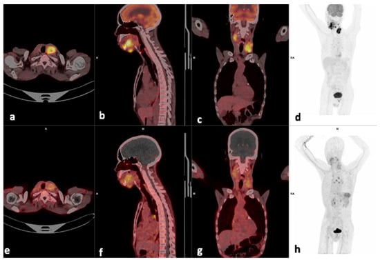 Example of a CXCR4-positive, FDG-positive patient. Display of maximum intensity projection (MIP), axial and coronal slices of both [18F]F-FDG PET/CT (a–d) and [68Ga] Ga-Pentixafor-PET CT (e–h) (interval between both scans, 3 days) in a 49-year-old female with oropharyngeal SCC (Patient #18). [18F]F-FDG PET/CT demonstrates intense uptake in the primary lesion (d) SUVmax 33.06 and right cervical lymph node (c) SUVmax 23.35. [68Ga] Ga-Pentixafor-PET also demonstrates intense tracer accumulation at the primary site (h) SUVmax 10.94 and cervical nodes 8.33 (g), respectively. CXCR4 IHC stain was strongly positive in 90% of the cells.