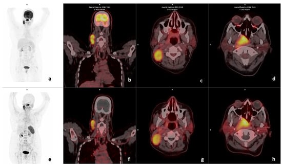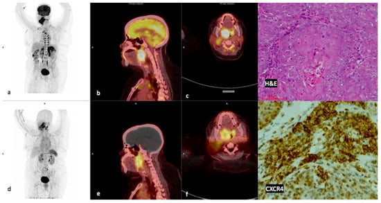 - Zhi, Y.; Werner, R.A.; Schirbel, A.; Higuchi, T.; Buck, A.K.; Kosmala, A.; Bley, T.A.; Hagen, R.; Hackenberg, S.; Rosenwald, A.; et al. Diagnostic efficacy of CXC motif chemokine receptor 4-directed PET/CT in newly diagnosed head and neck squamous cell carcinoma-a head-to-head comparison with [18F] FDG. Am. J. Nucl. Med. Mol. Imaging. 2023, 13, 208. [Google Scholar] [PubMed]