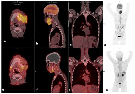Example of a moderate CXCR4-positive, high FDG-positive patient. Display of [18F]F-FDG-PET/CT (a–d) and 68Ga]Pentixafor-PET (e–h) (interval between both scans, 14 days) in a 60-year-old male patient with oral cavity SCC (patient #6). [68Ga]Pentixafor-PET demonstrates less intense tracer accumulation at the site of primary SUVmax 4.84 (b) compared with 18.36 on [18F]F-FDG (f), the left cervical node metastasis also showed more intense uptake on [18F]F-FDG (c), SUVmax 14.41 versus 5.29 on [68Ga]Ga-Pentixafor (g).