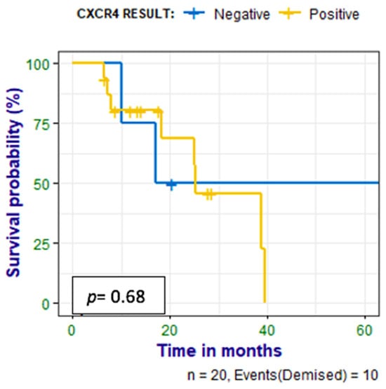Kaplan–Meier curves show no statistically significant difference between survival in the patients who had positive IHC stains for CXCR4 and those who had negative stains.