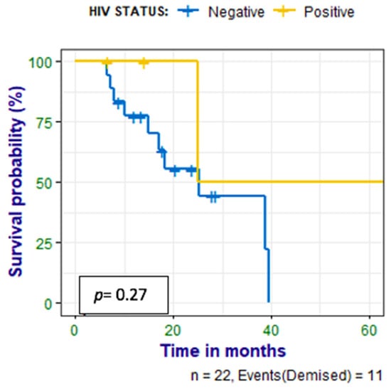 Patients were followed up for 6–65 (median 17) months, and a correlation was made between survival time and CXCR4 expression, Ki-67 expression, and HIV status. Nine (41%) of the patients had died at the time of data analysis; there was no statistically significant correlation between PET metrics and survival time, as shown in Figure 6. There was a negative correlation between survival time and Ki67 (r = −0.560 p = 0.010). There was also no correlation between survival time and the HIV status of the patient as shown in Figure 7.
