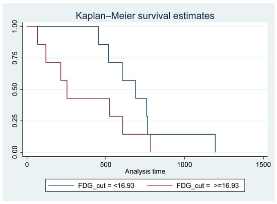 Survival time for patients with 18F-FDG SUVmax < 16.93 vs. >= 16.93 showing poorer survival in patients with FDG SUVmax >= 16.93; however, this did not reach statistical significance Pr > chi2 = 0.1670.