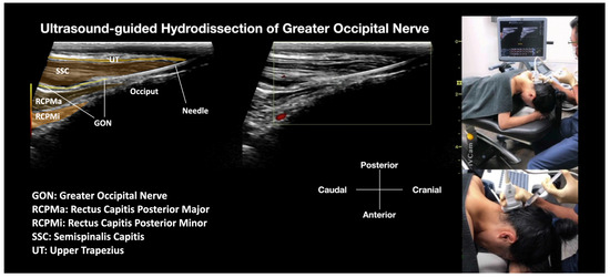 - Method: Due to the presence of hair in this region, a larger amount of 2% chlorhexidine in isopropyl alcohol is advised to be used as the disinfection agent. The disinfectant solution may need to be applied several times to ensure proper disinfection. It is also advised to use the same disinfectant solution as the contact media for the ultrasound transducer. The needle entry point is anesthetized with 0.5% lidocaine to create a skin wheel. With ultrasound guidance, a 25 G or 27 G 2-inch hypodermic needle is inserted. The physician keeps injecting with D5W with needle advancement to push away any soft tissue in front of the needle tip and create a halo, allowing the needle tip to follow from the subcutaneous fat to the site. This allows for the whole tract of the GON to be hydrodissected, within the UT and SCC, and between the SCC and RCPMa, as the GON passes through these anatomical structures. The soft tissue is completely hydrodissected above and below, lateral, and medial to the GON, with the GON completely encircled with anechoic fluid. During the procedure, in-plane and out-of-plane techniques will be used interchangeably to validate the needle position. Typically, 20 to 30 mL of D5W without local anesthetic will be used for one side of GON hydrodissection, from skin entry to complete hydrodissection of the GON, resulting in the patient’s pain being relieved.