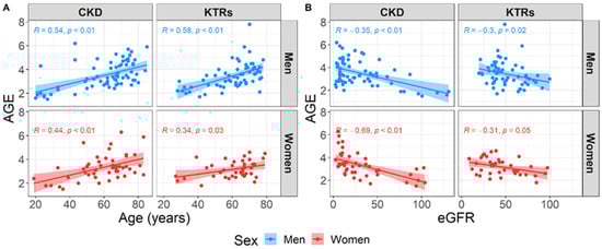 Correlation pattern between the advanced glycation end products (AGE) and age (A) or estimated glomerular filtration rate (B) stratified by sex.