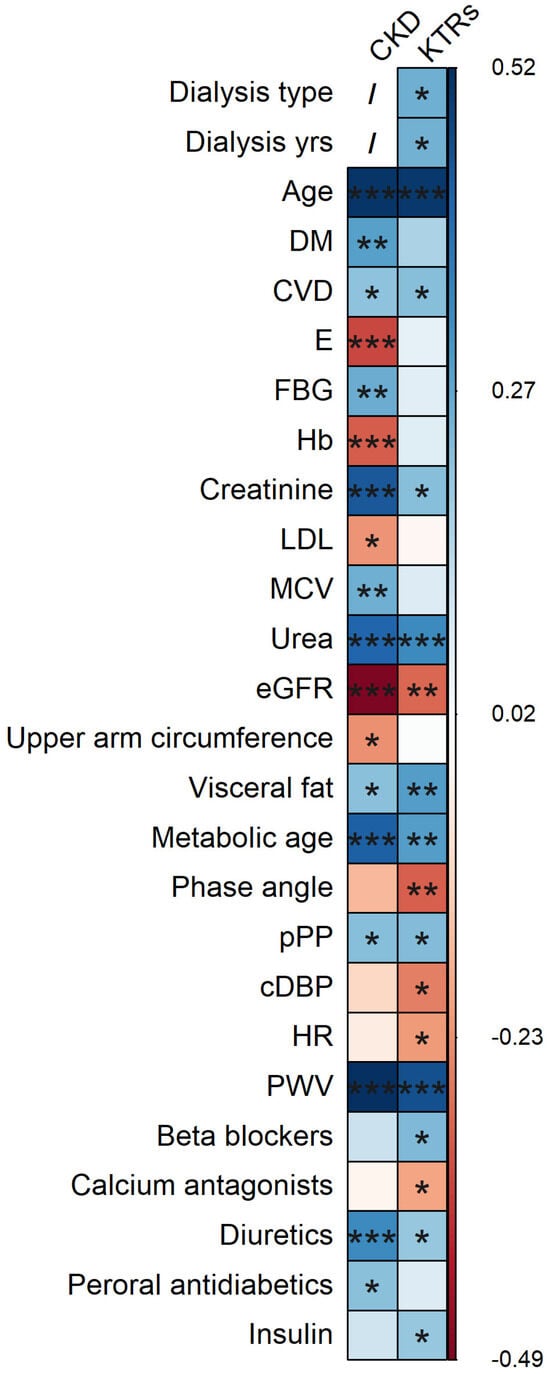 Spearman’s rank correlation plot for statistically significantly correlated parameters and advanced glycation end products (AGE), stratified by kidney disease modality. Abbreviations: CKD—chronic kidney disease, KTRs—kidney transplant recipients, DM—diabetes mellitus, CVD—cardiovascular disease, E—erythrocyte count, FBG—fasting blood glucose (mmol/L), Hb—haemoglobin (g/L), LDL—low-density lipoprotein cholesterol (mmol/L), MCV—mean cellular volume (fL), eGFR—estimated glomerular filtration rate using CKD-EPI (mL/min/1.73 m2), pPP—peripheral pulse pressure (mmHg), cDBP—central diastolic blood pressure (mmHg), HR—heart rate (beat/minute), and PWV—pulse wave velocity (m/s). p-values labels: *** p < 0.001, ** p < 0.01, * p < 0.05, and none—that correlation was not statistically significant (p > 0.05). Cells depicted in red represents negative correlation, while cells depicted in blue represents positive correlation; the deeper the shade the stronger is the correlation coefficient.
