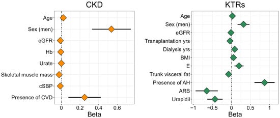 Due to the many measured parameters and the high correlations among them, we first performed a univariate linear regression adjusted for age, sex, and eGFR to analyse the influence of different parameters on the AGE levels separately for each group of participants (Supplementary Table S1). To perform the multiple linear regression, we then selected all the parameters with p-values < 0.2, excluded those that showed high collinearity between them (variance inflation factor, VIF > 4), and performed a stepwise linear regression using both backward and forward selection. The parameters that remained in the final model represent the predictors for increased AGE levels among the two groups of participants (Table 4, Figure 3). For both groups, increased AGE levels were predicted the most with older age, being male, and having lower eGFR levels. In addition, for the CKD group, increased AGE levels were associated with lower cSBP, while, for the KTRs group, increased AGE levels were influenced by more years spent on dialysis prior to KTx, less time since KTx, lower levels of trunk visceral fat, the presence of arterial hypertension, and if the participants did not use antihypertensive drugs urapidil and angiotensin II receptor blockers.