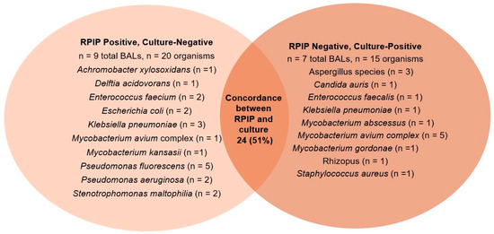 Concordance between RPIP and cultures, with discordant organisms listed in each circle.