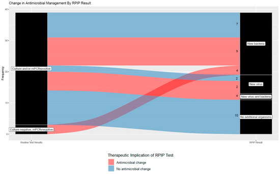 In 10 (26.3%) cases, no new organisms were identified by the RPIP and, therefore, no additional antibiotic would be indicated. Four culture- and BioFire®-negative cases had a result from the RPIP that could potentially lead to an antibiotic addition (Figure 3). The specific antibiotic changes for each case are listed in Supplement Table S2.
