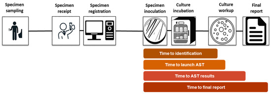 Turnaround times were calculated using the date and time of the specimen’s inoculation in the microbiology laboratory as a starting point for the analysis. Endpoints for the TATs were defined as the date and time recorded at the completion of each specified milestone of the urine culture workflow. The following TAT milestones were recorded: time until bacterial identification; time until the launch of AST and/or time to AST results (for positive cultures); and, ultimately, time to final report validation (Figure 1).