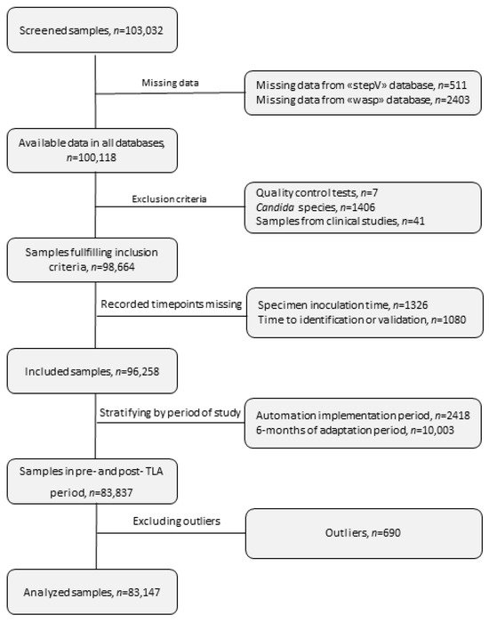 The following exclusion criteria were applied to all TAT results: analyses performed as part of a quality control procedure or samples belonging to clinical studies; cultures with positive results that yielded any Candida spp.; samples with missing recorded timepoints and TAT outliers. Outliers were defined as reports with a TAT 4 standard deviations above the median or a TAT of less than 6 h. The excluded outliers were specimens that did not follow standard processing and identification pathways. Finally, samples belonging to the TLA implementation period or the immediate post-implementation period were not analyzed.