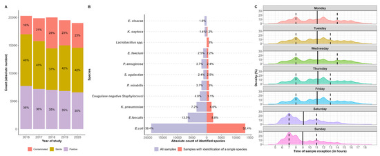 A total of 98,664 urine samples fulfilled the inclusion criteria. Figure 2 summarizes the inclusion/exclusion criteria and the sample filtration process. Table 1 describes the samples and the patients’ characteristics. Overall, approximately 36% (n = 35,351) of all samples turned out positive, among which 71% were monomicrobial infections and 29% were polymicrobial infections (Table 1). Contaminated and sterile cultures represented 22% and 42%, respectively, of all 98,664 urines investigated. A slight decrease in positive-sample rates was observed over time, with a concomitant increase in contaminated samples (Figure 3A). Eleven species accounted for >80% of all positive urine cultures (Figure 3B). As expected, E. coli, E. faecalis, and K. pneumoniae were most commonly isolated from the positive samples, followed by coagulase-negative Staphylococci, other Gram-negative Enterobacteriales, and non-fermenting bacteria (Figure 3B). In order to assess the workload of our workflow during the day, we recorded the specimens’ reception time for every day of the week (Figure 3C). We note a two-peak distribution of the reception of samples during the weekdays (early in the morning and at noon) and a one-peak distribution during the weekend (early in the morning) (Figure 3C).