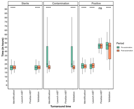 The median time from streaking to identification decreased from 22.3 h pre TLA to 21.4 h post TLA (p < 0.001) (Table 2). Similarly, the median time from streaking to final validation of the report decreased from 24.3 h pre TLA to 23 h post TLA (p < 0.001) (Table 2). While in the post-TLA period, the time from streaking to launching AST was longer (from 22.8 h pre TLA to 23.2 h post TLA) (p < 0.001), we did not observe any statistically significant differences in the time needed to finalize AST (from 46.9 h pre TLA to 47 h post TLA) (p = 0.065) (Table 2). Further analysis revealed that the observed differences in TAT were mainly driven by the contaminated and positive samples (Figure 5, Figure 6 and Figure S2). Besides the reduced TATs during the post-TLA period, we moreover observed decreased interquartile ranges for the different TATs (except for the time taken until the final validation of positive samples), suggesting improved standardization with the use of TLA (Figure 5). When we examined positive samples stratified by the number of identified microorganisms (monomicrobial vs. polymicrobial samples), we observed that the polymicrobial samples were those that resulted in increased time to launch AST and had a higher dispersion of TATs (Figure S3). Finally, we intended to identify potential bottlenecks of our workflow that could potentially be improved to further reduce TATs. Figure S4 compares the median TATs until pathogen identification or until the final validation of the report based on the samples’ reception times. Specific days or day timeslots were therefore identified that were associated with a longer time to results. Thus, samples received on either Fridays or Saturdays or samples received very early or very late during weekdays were associated with a longer TAT until validation.