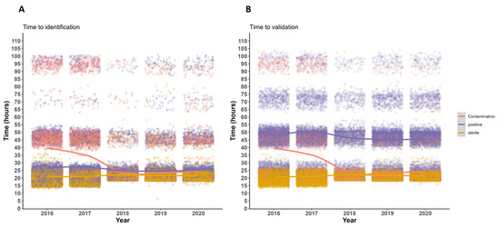 Scatterplot of TATs until identification and until final validation throughout the study period. Panel (A) shows the time until identification and panel (B) the time until final validation. Each dot represents one observation (one analyzed sample). The smooth colored lines show the general trends over time.