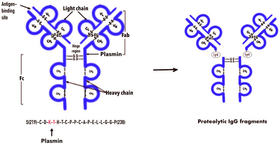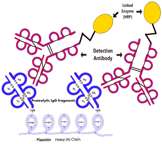 - Aisina, R.B.; Mukhametova, L.I.; Gershkovich, K.B.; Yakovlev, V.N.; Goufman, E.I.; Tikhonova, N.B. Effect of Specific Cleavage of Immunoglobulin G by Plasmin on the Binding and Activation of Plasminogen. J. Bioorganic Chem. 2018, 44, 210–216. (In Russian) [Google Scholar] [CrossRef]