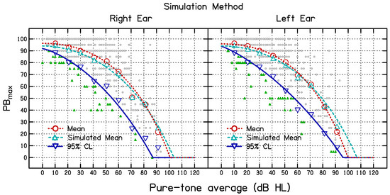 Dubno, Lee, Klein, Matthews, and Lam [7] adopted a different method for estimating the lower boundary of PBmax as a function of PTA. They considered 407 hearing-impaired ears from 212 participants, and divided them into 11 sub-groups based on PTA. The number of participants within each sub-group ranged from 18 to 50, which meant that the 95% confidence limit (CL) for each sub-group could not be determined accurately. To deal with this problem, a computer simulation method was used. The measured standard deviations (SDs) of the PBmax scores within each sub-group were always larger than the SDs estimated from the binomial distribution (see Equation (1) in Dubno, Lee, Klein, Matthews, and Lam [7]), on average by a factor of 1.62. Hence, for each PTA group, 2500 samples of normally distributed PBmax scores were generated using the mean determined from the experimental data and 1.62 times the SD estimated from the binomial distribution. Within each PTA sub-group, a one-tailed 95% CL was estimated from the simulation data. The values obtained in this way are denoted 95% CLS. A function was then fitted to the simulated 95% CLS values to predict the 95% CLS as a continuous function of PTA. Hereafter, this is referred to as the simulation method. The simulation method was adopted by Margolis et al. [12] for estimating 95% CL values for three sets of recorded speech materials, Q/MASS Tillman, VA, and Auditec [13].
