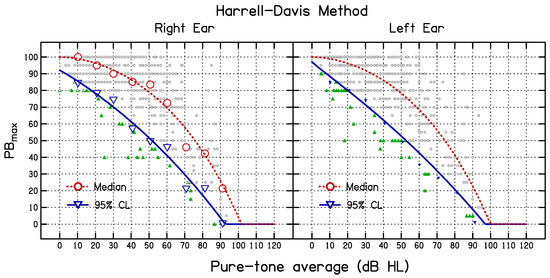 The pure-tone average (PTA) hearing threshold level (HTL), usually averaged across the frequencies 0.5, 1, 2, and 4 kHz, is the most commonly used index of peripheral hearing loss [5,6], and it has been used as a predictor of word scores, including PBmax values, in many studies [7,8]. Knowing if the PBmax obtained at a suprathreshold level is poorer than would be expected from the PTA is important when using PBmax for differential diagnoses [9,10]. For example, a poorer-than-expected PBmax might indicate a retro-cochlear disorder or auditory neuropathy. To determine whether the PBmax is lower than expected from the PTA, the lower boundary of the PBmax value expected for a given PTA must be estimated.