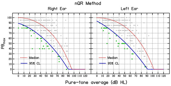 Results using the nQR method for the right ear (left side) and the left ear (right side). The dashed lines show the fitted median and the solid lines show the fitted lower 95% CLQR. The small green filled triangles show individual PBmax values below the estimated 95% CL and the small open circles show PBmax values above the 95% CL.