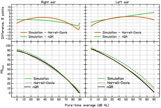 The lower left and right panels of Figure 5 compare the 95% CL as a function of PTA estimated using the simulation, HD, and nQR methods including all the data. The 95% CLs were very similar for the HD and nQR methods. The upper panels show the differences between the simulation and HD methods and the simulation and nQR methods. Compared to the HD and nQR methods, the simulation method led to slightly higher 95% CL values for low to medium PTA values for the right ear and for medium to high PTA values for the left ear. As a result, a greater percentage of the ears fell below the estimated 95% CLs for the simulation method than for the HD or nQR methods. For the simulation method, 6.8% and 6.7% of the PBmax values fell below the 95% CLS curve for the right and left ears, respectively, values that are above the target value of 5%. In contrast, for the HD method, 4.9% of the PBmax values fell below the 95% CLHD curve for both right and left ears and for the nQR method, 5.3% of the PBmax values fell below the 95% CLQR curve for both right and left ears, both close to the desired value of 5%.