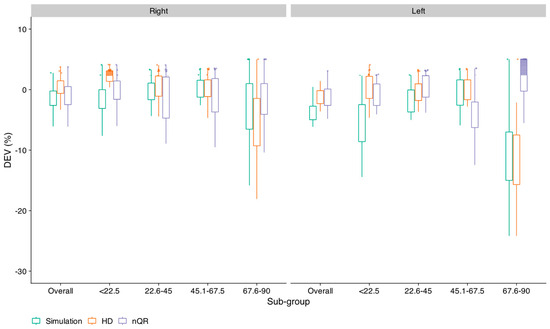 Overall, the simulation method showed the poorest accuracy. The HD and nQR methods showed similar accuracy, except for the PTA sub-group with the highest PTA, for which the nQR method showed better accuracy than the HD method, especially for the left ear. A mixed analysis of variance (ANOVA) was performed on the DEV values with ear and method as within-subject factors and the PTA sub-group as a between-subject factor. The Greenhouse–Geissler correction was applied to the degrees of freedom when the condition of sphericity was not met, but the uncorrected degrees of freedom are reported. There were significant main effects of method [F(2, 192) = 18.1, p < 0.0001, = 0.045], ear [F(1, 96) = 34.0, p < 0.0001, = 0.036] and PTA sub-group [F(3, 96) = 16.7, p < 0.0001, = 0.32]. There were significant two-way interactions of ear and method [F(2, 192) = 13.8, p < 0.001, = 0.033], method and PTA sub-group [F(6, 192) = 29.7, p < 0.0001, = 0.189], and ear and PTA sub-group [F(3, 96) = 7.1, p < 0.0001, = 0.023]. The three-way interaction of method, PTA sub-group, and ear was also significant [F(6, 192) = 11.1, p < 0.0001, = 0.077]. The main interest here is the effect of the method. Averaged across PTA sub-groups and ears, the values of DEV were −3.2, −1.8, and −1.1% for the simulation, HD, and nQR methods, respectively. Pair-wise comparisons with Bonferroni correction showed that there were significant differences between the simulation method and the HD (t = −3.7, p < 0.001) and nQR (t = −5.9, p < 0.001) methods, but no significant difference between the nQR and HD methods (t = −2.1, p = 0.098).
