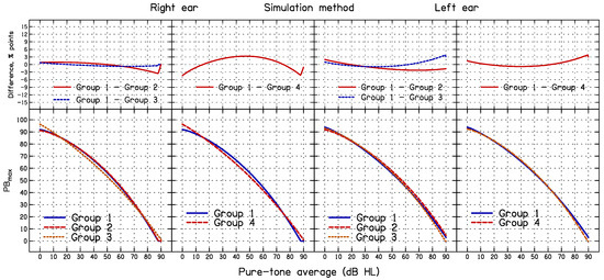 Fitted functions obtained using the simulation method for each of the four grouping methods are plotted in the lower panels of Figure 7, separately for the right and left ears. Group 1 is the same as used previously in the analysis of the simulation and HD methods. The differences between Group 1 and Groups 2–4 are plotted in the upper panels of Figure 7. The differences range from about −4 to 4 percentage points, with RMS differences ranging from 0.53 to 2.3 percentage points for the right ear, and from 1.2 to 1.6 percentage points for the left ear. This is unfortunate, because it is not obvious what grouping is the most appropriate one to use. For Groups 1 to 4, approximately 6.8%, 6.3%, 7.3%, and 7.8% of the PBmax values fell below the estimated 95% CLS, respectively, for the right ears and approximately 6.7%, 7.1%, 8.1%, and 8.2% of the PBmax values fell below the estimated 95% CLS for the left ears. Thus, regardless of grouping, the percentage of PBmax values below the estimated CLS values was greater than the target value of 5%.