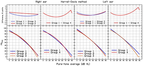 The fitted functions obtained using the HD method for each of the four PTA grouping methods are plotted in the lower panels of Figure 8, separately for the right and left ears. The differences between Group 1 and Groups 2–4 are plotted in the upper panels of Figure 8. The differences range from about −3 to 10 percentage points, with the RMS differences ranging from 2.0 to 3.7 percentage points for the right ear, and from 1.3 to 3.0 percentage points for the left ear. For Groups 1 to 4, approximately 5.4%, 5.3%, 4.9%, and 5.3% of the PBmax values fell below the estimated 95% CLHD, respectively, for the right ears and approximately 4.9%, 4.8%, 4.9%, and 4.8% of the PBmax values fell below the estimated 95% CLHD for the left ears. Thus, regardless of grouping, the percentage of PBmax values below the estimated CLHD values was close to the target value of 5%.