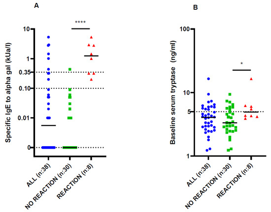 (A) Specific IgE levels in the whole study population and in patients without and with a reaction to cetuximab. (B) Baseline serum tryptase levels in the whole study population and in patients without and with a reaction to cetuximab. * p < 0.05 and **** p < 0.0001 for comparison between groups using the unpaired t-test.