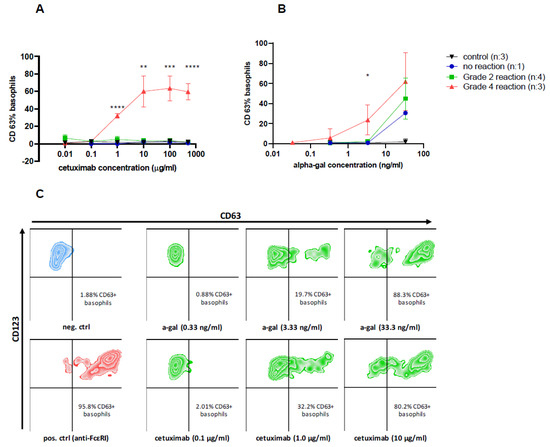 A basophil activation test (BAT) in response to stimulation with (A) cetuximab, (B) alpha-gal in alpha-gal-sensitized patients with different grades of reaction to cetuximab, and (C) representative plots of the BAT analysis of a patient with a history of grade 4 reaction during the first application of cetuximab. Increasing concentrations of cetuximab (from 0.01 to 500 µg/mL) and alpha-gal (from 0.033 to 33.3 ng/mL) were used for stimulation. For control stimuli, basophil stimulation buffer alone and 0.55 µg/mL of anti-FcεRI mAbs were used. * p < 0.05, ** p < 0.01, *** p < 0.001, and **** p < 0.0001 for comparison between groups using the unpaired t-test. The severity was evaluated according to Common Terminology Criteria for Adverse Events (CTCAE) v 5.0 [26].