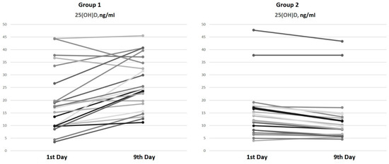 On the ninth day of hospitalization, an increase in serum 25(OH)D levels of 45.8% [16.9; 98.4] in patients from Group 1 (bolus cholecalciferol therapy) and a decrease in 25(OH)D levels of 17.9% in patients from Group 2 (without cholecalciferol therapy) were observed (Figure 1).
