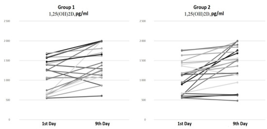 The paired comparison analysis on the first and ninth days of hospitalization revealed an increase in both the 25(OH)D (p < 0.001) and 1,25(OH)2D (p < 0.001) levels by the ninth day in Group 1 (bolus cholecalciferol therapy). Despite the negative dynamics of the 25(OH)D level by the ninth day (p < 0.001) in Group 2 (without cholecalciferol therapy), an increase in the 1,25(OH)2D (p < 0.001) concentration was also observed.
