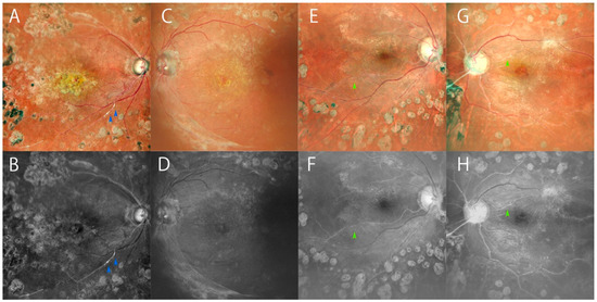 Color and blue SLO images show irregular hyper-reflective appearance of retinal arterioles in DR eyes. (A) Color SLO image of right eye of a 72-year-old woman with PDR. (B) Blue SLO image of (A) shows white arterioles indicating severe arteriosclerosis (Grade 3). Irregularities (blue arrowheads) are observed. (C) The color image of fellow eye of (A) (Grade 3). (D) Corresponding blue SLO image of C showing uneven white arterioles. (E) Color SLO image of right eye (Grade 3) of a 70-year-old woman with low-attenuated irregular arteriole (green arrowhead). (F) Corresponding blue SLO image of (E). The arteriole (green arrowhead) is more easily identified in the blue SLO image. (G) The color image of fellow eye of (E) (Grade 4). (H) Corresponding blue SLO image of (G). The arteriole shows uneven irregular hyper-reflection.