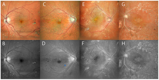 Additionally, we examined the rate of findings in blue SLO images of patients with a history of general complications commonly accompanying DM. Among DM patients with a history of hypertension, irregularities of retinal arterioles in blue SLO images were frequently found in eyes with advanced arteriosclerosis. However, there were no significant differences in irregular findings in all patients with hypertension (72 cases). Conversely, among all DM patients with renal dysfunction (51 cases), the percentage of those with irregularities found in the fundus of either eye on SLO images was significantly higher (p = 0.038). This suggests that lesions of retinal arteriosclerosis are possibly related to the history of renal dysfunction in DM patients. As shown in Figure 2G,H, the SLO image of the eye of a patient undergoing hemodialysis shows severe arteriosclerosis with an entirely white hyper-reflective appearance. Simultaneously, the vessels show irregularities of arterioles as well. This result seems logical given the evidence that patients with chronic renal failure [23] or hemodyalysis accompanied by vascular calcification face a major risk of developing arteriosclerosis [24].