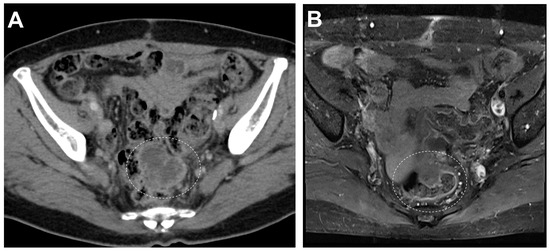 Follow-up computed tomography (A) taken four months after surgery revealed a lobulated cystic mass (dashed circle) measuring approximately 5 cm with irregular wall thickening within the pelvic cavity and papillary nodules around the vaginal stump. Pelvic MRI (B) revealed solid and cystic mass (dashed circle) and peritoneal seeding lesions up to 2 cm in diameter adjacent to the rectosigmoid junction. The treatment regimen was converted from adjuvant to palliative chemotherapy as evidence of peritoneal metastasis was found. Considering that AGCTs have been reported to have a propensity for late recurrence [29], the rapid growth of this tumor is likely attributed to a recurrence of the MLA component; furthermore, it is suggested that the collision tumor exhibits more aggressive behavior.