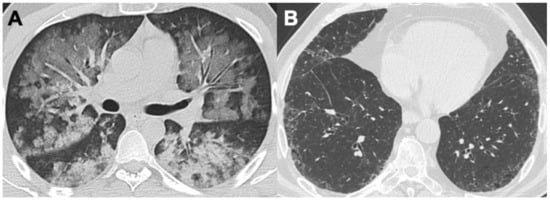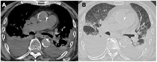 Lymphomatoid granulomatosis (LYG), also known as angiocentric lymphoma and angiocentric immunoproliferative lesion, is a rare lymphoproliferative disorder caused by the Epstein–Barr virus (EBV), usually presenting in adults in their fourth to sixth decade of life [94]. Lung involvement occurs in 80% of cases and the main CT features include small (<1 cm), bilateral, coalescent pulmonary nodules, together with large necrotic lesions that may cavitate. Nodules are generally located in the lower lung areas, along the bronchovascular structures or interlobular septa [95,96]. In addition, thin-walled cysts and enlarged mediastinal lymph nodes may be seen. Pulmonary artery wall involvement may present either with wall thickening or as intraluminal filling defects [97,98]. Respiratory failure, pulmonary embolism, and massive hemoptysis are potentially life-threatening conditions in advanced LYG.
