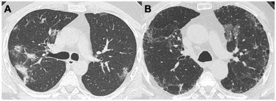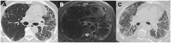 Microscopic polyangiitis (MPA) is a necrotizing vasculitis that affects arterioles, venules, and alveolar capillaries, characterized by a paucity or absence of immune complexes. Unlike GPA, in MPA the absence of granulomatous inflammation is peculiar. The incidence of MPA is approximately 1.5 per 100,000 people, typically affecting middle-aged individuals, with a slight predilection for males. Glomerulonephritis is the most common manifestation (~90%), while pulmonary diffuse capillaritis is observed in about 30% of cases. Hemoptysis can be the first symptom of alveolar hemorrhage in patients with MPA and might be one of the first reasons for patients to seek further evaluation [18,19]. With HRCT, MPA findings are often unspecific and in keeping with diffuse alveolar hemorrhage (DAH). Therefore, a patchy or diffuse GGO and a “crazy-paving” appearance, mainly with perivascular distribution, are the most frequents patterns occurring in up to 75% of patients. Consolidations, as a consequence of complete alveolar filling, might be an evolution of GGO. Additionally, reticulations and bronchiectasis are observed in 40% of cases [7,20,21]. Moreover, MPA may be associated with interstitial lung disease (ILD). In these cases, lung changes are usually symmetrical and often involve the periphery and lower lung lobes, defining a usual interstitial pneumonia (UIP) pattern (50–71% of cases) (Figure 2 and Figure 3); less commonly, non-specific interstitial pneumonia (NSIP) patterns and desquamative interstitial pneumonia (DIP) patterns are observed, respectively, in 7–31% and 14% of cases [8,22,23]. Pleural effusion may be noted, although pleuritis is rarely described [24].