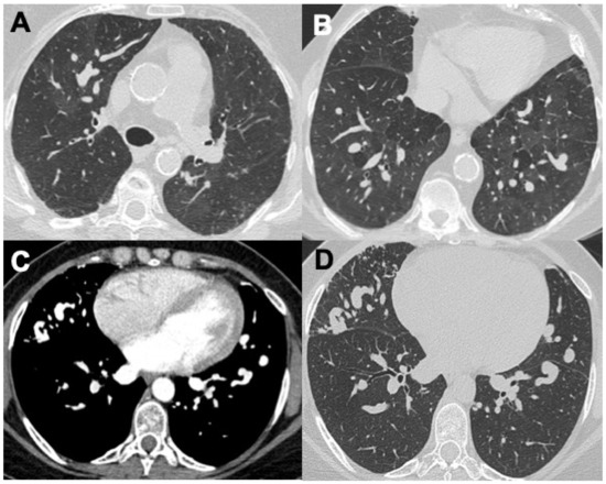 Giant cell arteritis, also known as Horton’s (or temporal) arteritis, is an inflammatory process affecting medium- and large-caliber arteries. GCA is the most common primary systemic vasculitis, characteristically affecting one or more branches of the extracranial carotid artery, particularly the temporal artery; however, systemic vasculitis of the large- and medium-caliber arteries are often present. GCA is closely associated with polymyalgia rheumatica, occurs in individuals older than 50 years (typical onset between 70 and 80 years), and more frequently in women. Characteristic symptoms consist of tender and swollen temporal arteries, temporal headache, claudication of the jaw, and loss of vision [54,55]. CT findings of GCA may resemble TAK with arterial wall thickening, stenosis, thrombosis, and aneurysms, with a greater predisposition in dissection depending on whether the aortic arch is involved. Pulmonary involvement in GCA is rare; the unusual involvement of the bronchial arteries was shown in the necropsy of a patient with disseminated GCA [56]. Interstitial lung disease (ILD) may be observed in the form of a UIP-pattern or indeterminate pattern, whereas pleural effusion is rare [57,58].