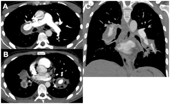 A case of pulmonary arterial involvement in Beçhet’s syndrome, showing large bilateral pulmonary artery aneurysms with eccentric thrombosis, in a young male with massive hemoptysis who arrived at the emergency department. The figures are a CT pulmonary angiography (CTPA) study: (A,B) in the axial plane and (C) in the coronal one.