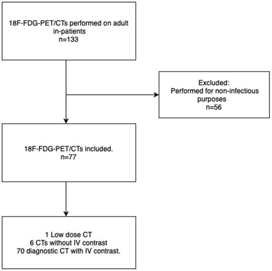 We identified 133 [18F]FDG-PET/CTs performed in search of an infectious focus in patients admitted to the hospital. Of the 133 scans, 56 were excluded because the [18F]FDG-PET/CT was performed for purposes unrelated to infection. Thus, 77 cases were included in the study; 70 scans (91%) were performed with contrast-enhanced diagnostic CT, seven were performed as diagnostic CT without contrast due to kidney disease or insufficiency; and only one was performed as low-dose CT. The inclusion process is visualised in Figure 1.