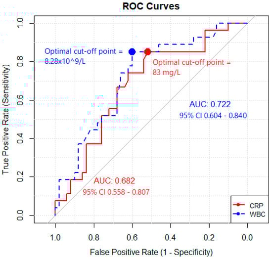 No true positive cases exhibited CRP levels within the normal range; the range of CRP for true positive cases was 11–340 mg/L. Otherwise, CRP showed a moderate diagnostic performance with an AUC of 0.682 with a 95% CI from 0.558 to 0.807. WBC was found to be slightly better, with an acceptable diagnostic performance of 0.722 with a 95% CI of 0.604–0.840. The optimal cut-off point for CRP was 83 mg/L with a sensitivity of 85% and a specificity of 52%. The optimal cut-off point for WBC was 8.28 × 109/L with a sensitivity of 85% and a specificity of 60%. However, from a clinician’s point of view, such cut-off values may be considered speculative and of little value in a clinical reality.