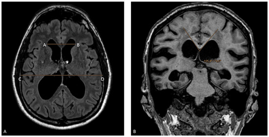 Board-certified radiologists with >5 years of neuroradiological experience visually examined the MRI datasets of all subjects for acute cerebral pathology and the presence of the imaging inclusion criteria. An experienced neuroradiologist (Z.B. with nine years’ experience in neuroimaging) verified all the documented qualitative radiological signs of iNPH and measured two semi-quantitative scores, namely the Evans’ index and the corpus callosal angle. The interpretation of the Evans’ index is as follows: 0.20–0.25, normal; 0.25–0.30, possible or early ventriculomegaly; and >0.30, ventriculomegaly [17]. The ratio varies with age and sex; therefore, the ratio can be higher in a normal healthy elderly individual [18]. The corpus callosal angle should be measured on a coronal image perpendicular to the anterior commissure–posterior commissure (AC-PC) plane at the level of the posterior commissure [16,19]. INPH patients have smaller angles than those with ventriculomegaly from atrophy or normal controls: a normal value is between 100 and 120°; in patients with iNPH, the value is <90°. Examples of both radiological markers are visually shown in Figure 1.